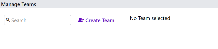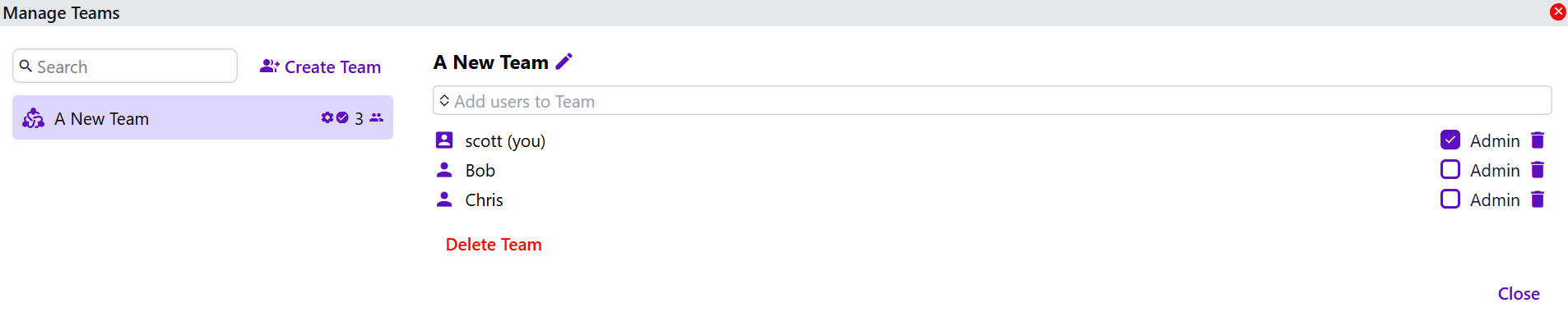 Making a Team is done with File > Manage > Teams. In the Teams dialog, click the group_add Create Team button, and provide a name.