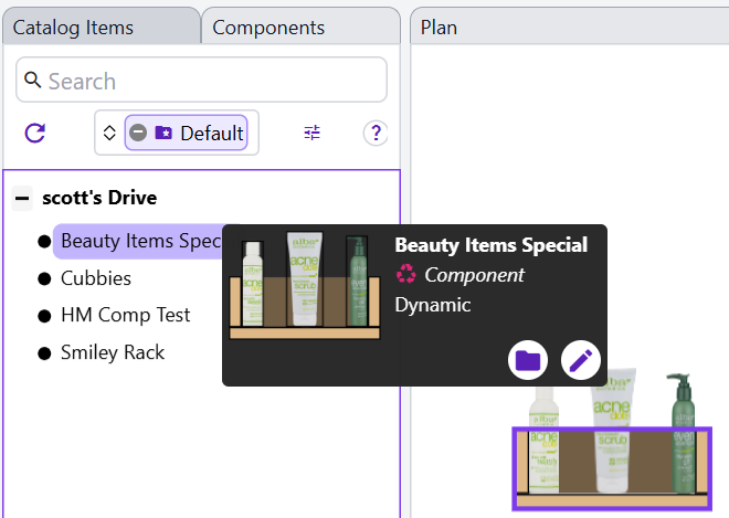 For example, below we have created a Component called Beauty Items Special, which is a Container fixture holding several different beauty products. Whenever this Component is opened and changed, the next time any Plan containing this Component is opened, it will update to reflect the changes made.