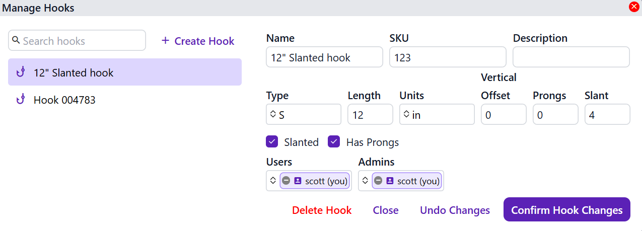 Pressing Confirm Hook Changes or Delete Hook will affect all Plan files that have items using that hook -- make changes with caution.