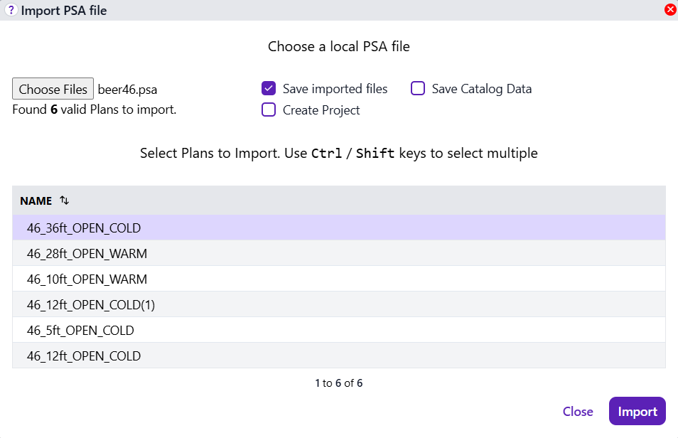 Choose a PSA file via the Choose Files input. If the file is valid, a list of included planograms will appear:
